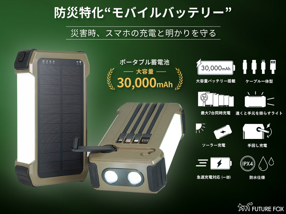 大容量30,000mAh+ソーラー・手回し充電で、